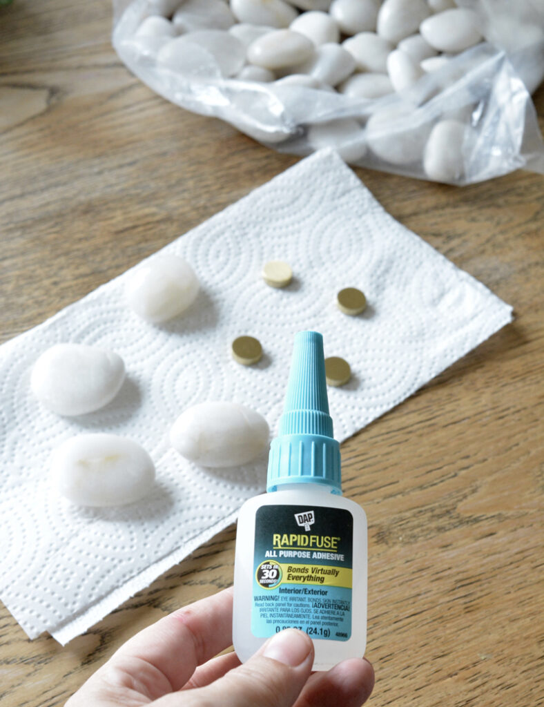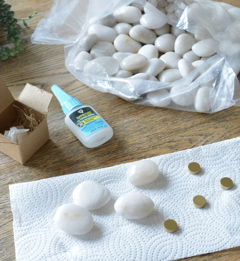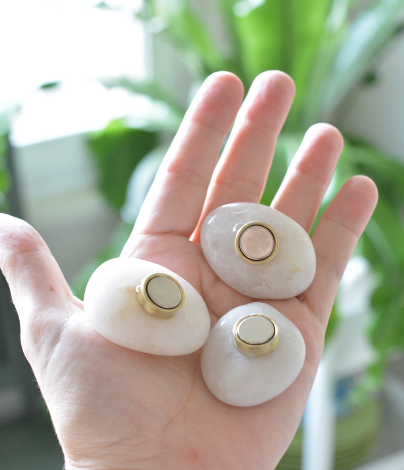 I bought a set of gold circle magnets and river stones online (I bought the 2-4 cm size), then used an all purpose adhesive to attach them to the stones.