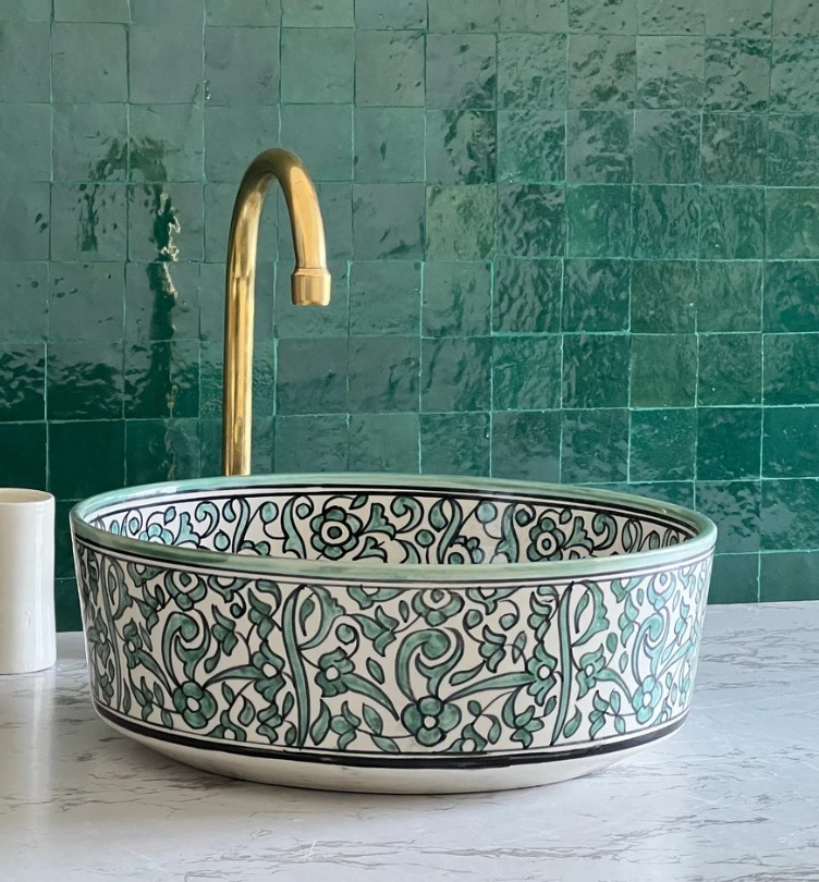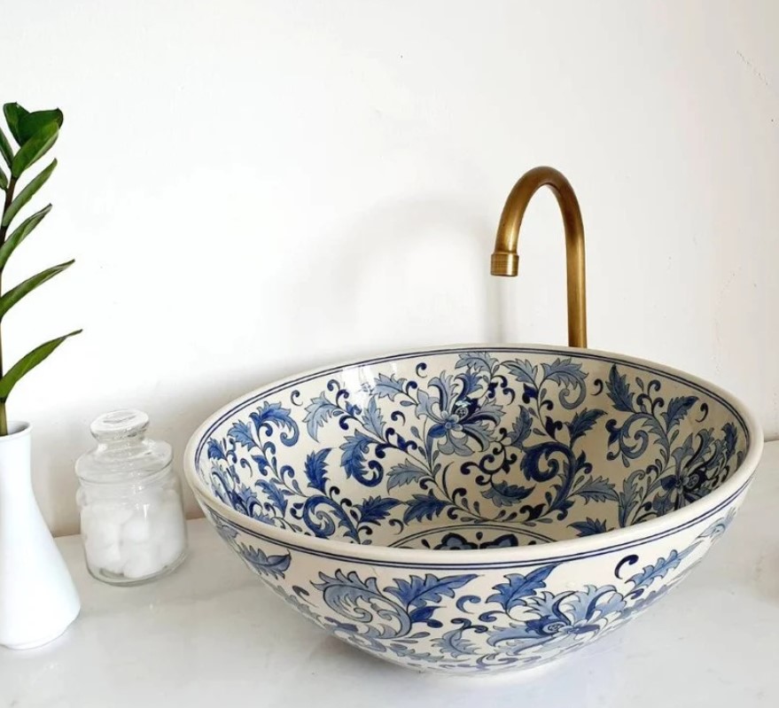 I’m inspired by my travels to Italy where hand painted ceramics are part of the aesthetic in this region of the world. I stumbled upon a collection of hand painted ceramic sinks that caught my eye. It’s been my experience that basin sinks are less practical for daily use in primary bathrooms (I prefer undermount in those spaces), but they are perfect for half bath or powder rooms where guests use the facility to wash their hands.