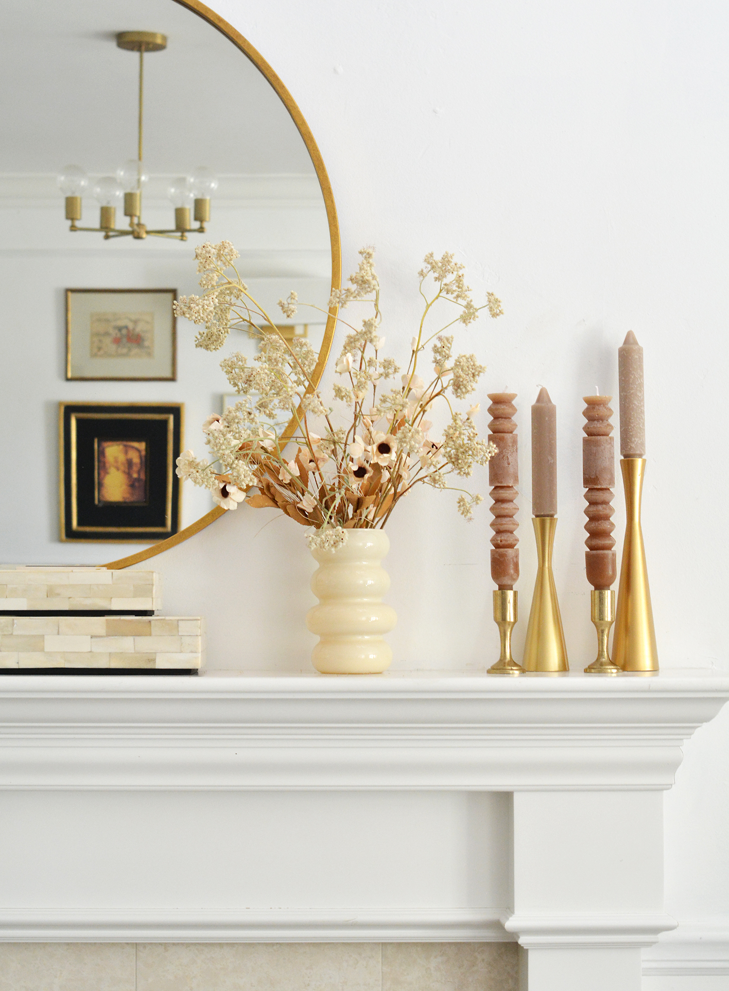 The air is getting cooler here in Northern California, it makes me want to pull out all my cozy autumn decor and layer it around the house. I started playing around with a fall mantel with some new taper candlesticks, I’d like to buy a few more so I can light them up all in a row while I relax in our living room this autumn.